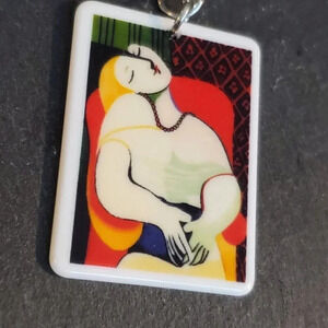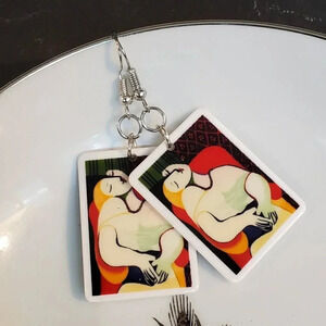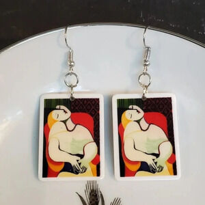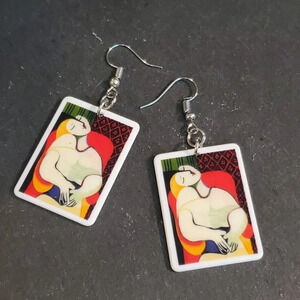 Handmade Woman Red Picasso Painting Lucite Acrylic Rectangle Pendant Earrings