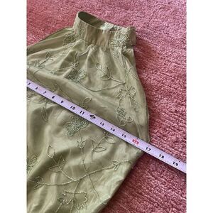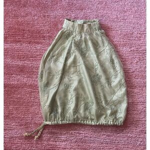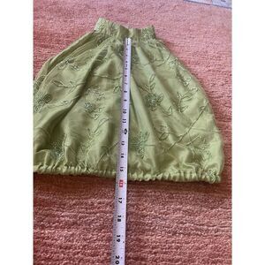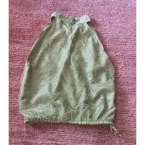This handmade women's blouse in size XS features beautiful bead and embroidered accents in green. this top is meant to be hand washed only. The cropped bottom is tightened with a drawstring. It looks great with jeans for any party.