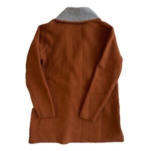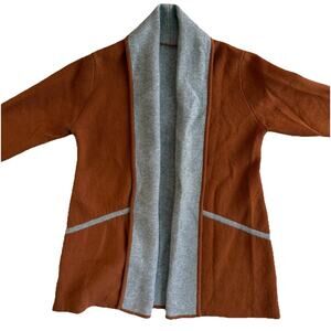 Handmade Vintage Style Super Warm and Soft Jacket Shawl Collar Cardigan Size Medium. Color Block Camel Brown & Gray Double Layer Lined Open Front. No pockets and is not reversible despite look (will show inverted seams. No material tag but this sweater is so soft it feels like a cashmere or may be a wool blend. Very warm and very unique