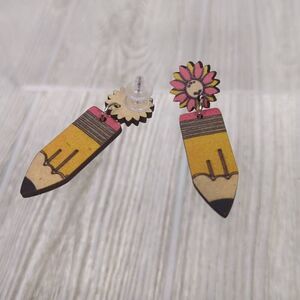 Handmade Womens Floral Pencil Pierced Earrings Yellow Pink Teachers Gift 2.5"