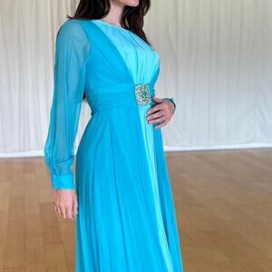 Handmade Women’s Medium Gown Blue Aqua Vintage 1960s Sheer Long Sleeve Gown. no tags, Diamond Brooch,