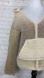 Women's handmade beautiful, warm and cozy sweater which pairs well with jeans, pants, skirts and can be layered. It is hooded, kangaroo hand warmer pocket, hand knit, v-neckline, long sleeves, soft tight blended knit virgin wool, color is Ombré off white and tan color block. Care machine wash delicate cold line dry. Material 70% Polyamide, 20% Acrylic, 10% Virgin Wool. Care machine wash delicate cold line dry. This was handmade in San Jose California by an artist who has a passion and talent in creating quality beanies, sweaters, scarfs and dog sweaters. Condition new never worn. Please preview the measurements to ensure fit. Size 6 dress form used in photos.