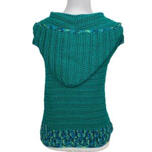 Handmade crochet green sweater with multi-colored accent pocket/trim. This beautiful new never worn, thick warm, and cozy cap sleeve, the tight-knit sweater is handmade, kangaroo hand warmer pocket and hooded. Care machine wash cold and lay flat to dry. Material acrylic yarn. Condition is new and handmade. Please preview measurements to ensure fit. This was hand knitted in San Jose by a artist who has a passion and talent in creating quality beanies, sweaters, scarfs and dog sweaters.