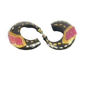 Handmade wood bead necklace with matching earrings, hand painted in black and pink. One-of-a-kind boho West Africa jewelry set with a bold, unique statement style.