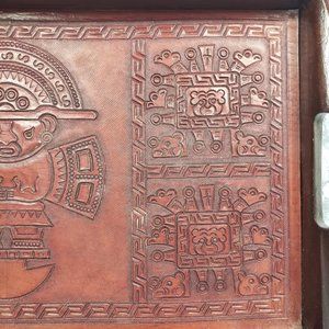 Handmade Wood Embossed Leather Mayan Serving Tray Vintage