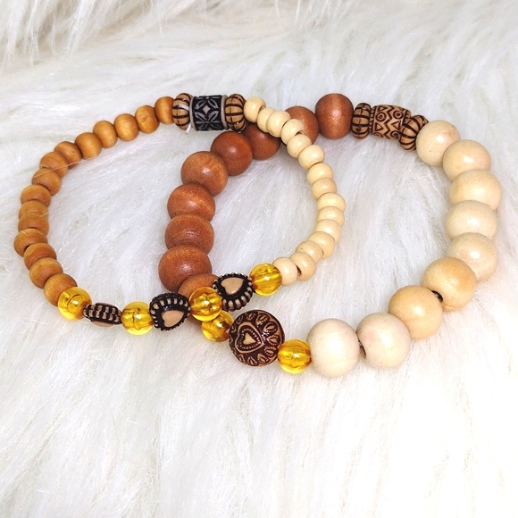 Handmade, stretchy cord, wood stackable bracelets (2) Size 6.5"-7" Bohemian Style; heart beads