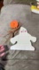 The hand made ghost measures approx 9 x 7 in. and stands as a freestanding cutout with authentic vintage character. The hand crafted pumpkin balloon features a classic carved jack-o’-lantern face in orange, creating a delightful contrast against the cream-painted ghost figure.