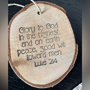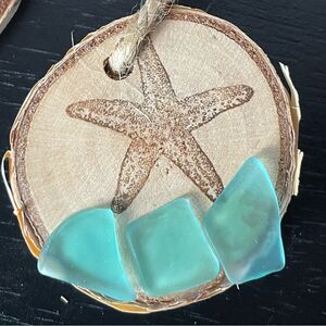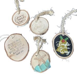 Beautiful small circular hand cut & hand designed unique wooden ornaments made of birch wood. Rope like hangers. Small imperfection on one of the ornaments, but these will enhance the beauty of your Christmas tree. They are all different and unique with one that has sea glass on the front and back.