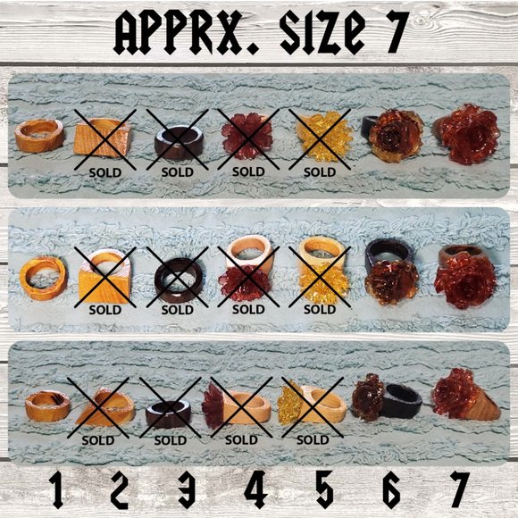 Choose one or all of these hand-crafted wooden rings that will catch everyone's eye, amazing conversation piece, easy way to make any outfit even more hip. Carefully carved from hardwood with smooth sanded & light polyurethane finish! Priced per single ring, please note #1-7 in comment once purchased to ensure you receive correct ring.
