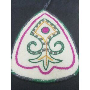 A really great vintage piece of kitchen decor from the Central Asian country Kyrgyzstan. These potholders are connected by a twisted rope wood cord. Cream colored background with hand stitched green and gray edges. The design is done in green, gray, yellow and pink.