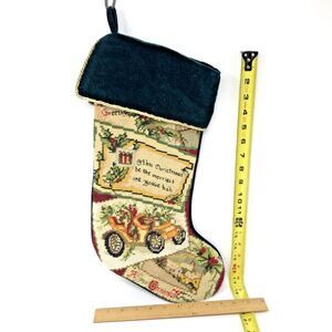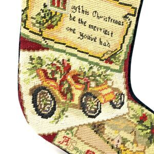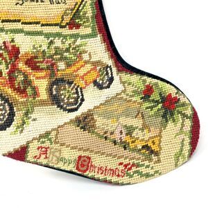 Vintage 80s Handmade Wool Needlepoint Christmas Stocking with Dark Green Velvet trim, Gold Cording & a Cotton lining. Seasons greetings and Antique Car design.