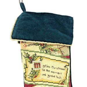 Handmade Wool Needlepoint Christmas Stocking Vintage Green Velvet Gold Cording