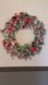 This handcrafted Christmas holiday wreath was made using a metal wire round shape and then covered with different pieces of Christmas design material. This would look perfect hanging on any door or wall for the holiday season. It measures approximately 19 inches in diameter.