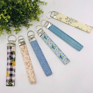 Each key fob is made with two pieces of cotton fabric. A layer of felt sewn between them ensures a comfortable experience. These measure approximately 6 inches tall and 1 inch wide.