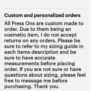 All press on nails have a number on the inner tip. Those numbers will let me know what size u need for example my numbers are 0 for thumbs, 3 for my index finger, 2 for my middle finger, 3 for my ring finger and a 6 for my pinky. My numbers are considered a size large. A small set is 2,5,4,6,9, a medium is 1,5,4,6,8 and a large is 0,4,3,5,7. I have samples packs available for purchase which includes all the different sized nails and they are numbed with a black marker so u can see clearly and you just try the different nails to see which ones fit each finger and then u would message me with your numbers or if you have some press on nails just look at the inner tip and let me know your numbers and lastly you can measure your nails. If you have a soft measuring tape you would use the CM side and measure the widest part of your nails and count how many lines are within the measurements for example if you have 14 lines then it would be 14MM. Do that for each finger and then look at my chart that I'm including and you will see what size you need or take a piece of scotch tape and tape across your nail and take a marker and mark the widest part of your nail and the take the piece of tape off and put it on the measuring tape and count the lines that way. Any other questions, feel free to ask😊