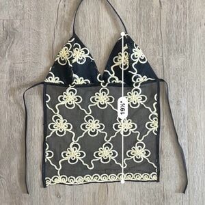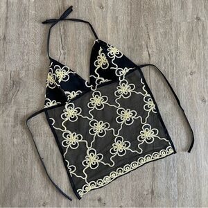 Rare, one-of-a-kind gothic fairycore top crafted from sheer black mesh, embroidered with gold floral details and shimmering sequins. The delicate beading and ethereal design make this the perfect statement piece for any dreamer who loves vintage Ibiza glam and Y2K nostalgia.