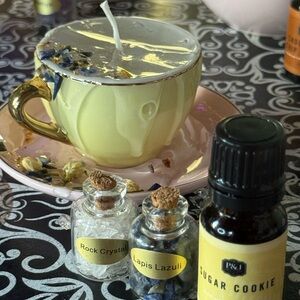 Charming yellow teacup candle paired with sugar, cookies essential oils and lapis lazuli crystals. Perfect for relaxation and decor.