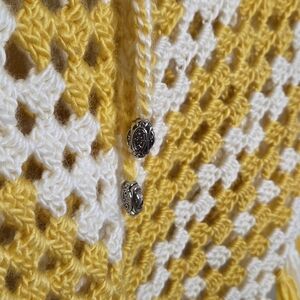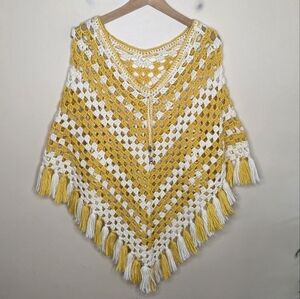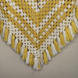 Handmade Yellow & White Crochet Poncho with Fringe.