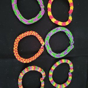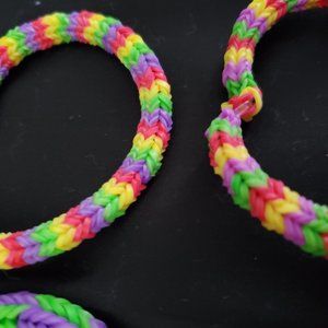 This Yellow and Green Rubber Band Bracelet Set includes six colorful bracelets with yellow, green, purple, and red; that fits a 7 inch wrist with some stretch.
