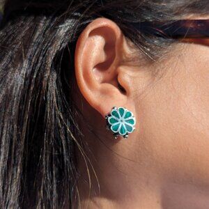 Discover the Timeless Elegance of our Native American Malachite Inlay Floral Stud Earrings. Elevate your style with this exquisite Navajo earrings. Meticulously handcrafted by skilled a Native American artisan, Pino Yurie. This masterpiece showcases the unique beauty of silver and malachite. Length: .75 in. Weight: 7 grams Features: - Genuine malachite gemstones: Each stone is hand-selected for its vivid color and exquisite matrix patterns. - Sterling Silver Craftsmanship: The earring is expertly crafted in 925 sterling silver, known for its enduring quality and radiant shine. - Navajo Tradition: This earring honors the rich heritage and artistry of the Navajo people, reflecting their deep connection to the natural world.