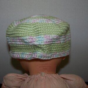 This soft cotton new born cap is a soft mint green with some pink white and blue mixed in.