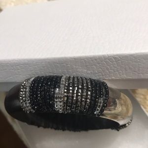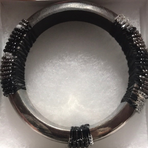 Handmade bangle dark silver with strung beads carefully placed on two sides and a smaller section of beads strung on the opposite sides.