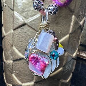 This stunning multicolor wire wrapped pendant in made from glass found on the beach, wire wrapped and embellished with beads. The necklace is a unique addition with silver ornate spacers and hand painted wooden beads.