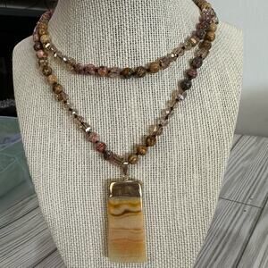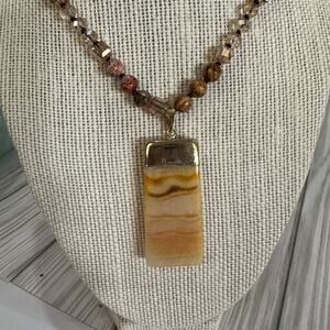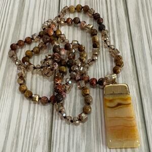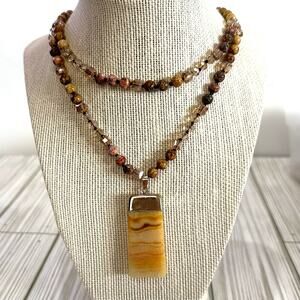 Handmade long Jasper and crystal beaded necklaced with agate pendant