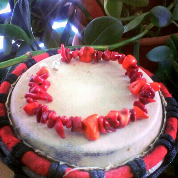 This bangle has never been worn before. Made with bamboo coral, and howlit chips. Add some colour to your wardrobe with this burnt orange bracelet!
