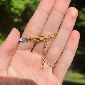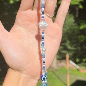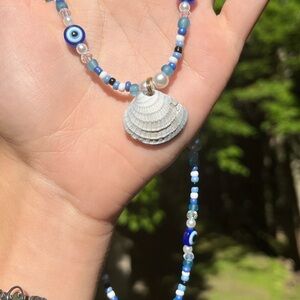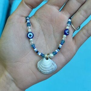 Handmade by me, this one of a kind necklace consists of glass, plastic, and ceramic beads. It has a blue evil eye design along with shell accents and a center shell charm. The gray shell in the center is a real shell that I collected from the ocean myself. It has a gold lobster, claw clasp and a chain for multiple sizes. Avoid harsh surfaces and long contact with water, any questions please ask. If you like this item, I encourage you to check out my other items. make me an offer and I’ll see what I can do!
