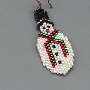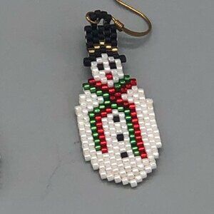 Adorable handmade beaded snowmen earrings, perfect for adding festive charm to your holiday outfit. These 2" long earrings feature a classic black and white design with a cute hat detail.
