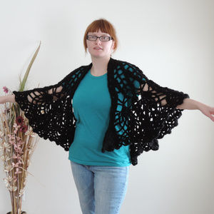 Accessorize in style with this hand made crocheted shawl. A pretty pineapple pattern made with a soft, black bulky weight yarn, this shawl would be perfect for those chilly evenings when you just need a little something around your shoulders.