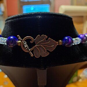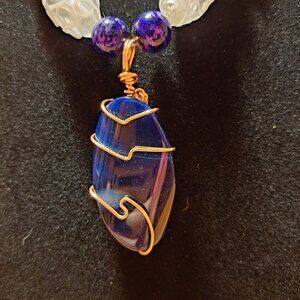 Handmade blue and white glass and agate necklace copper wire wrapped