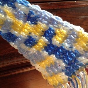 This handmade scarf features shades of light blue, med. blue, yellow, and white in a multi pattern. Also is detailed with fringe.
