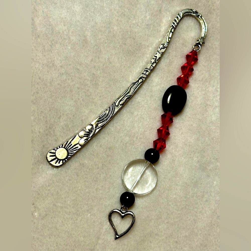 Red and black metal bookmark with heart charm. Perfect gift for someone who loves to read!