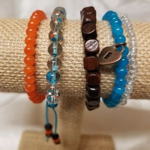 *4 stretch bracelets and 1 made on aqua/blue knotting cord with square knot closure