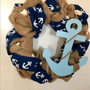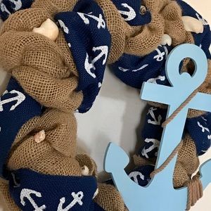 Made by me, I used a wire wreath form and wrapped burlap and blue burlap ribbon around. Added an anchor, some shells, and a tad of rope for decoration. Perfect for spring and summer! This measures about 16 to 18 inches in diameter.