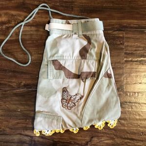 Handmade camo, butterfly, crocheted purse! Shoulder or handbag style, brown butterfly appliqué, crocheted lace details in pocket and base. Can cinch up like a drawstring bag and has pockets on side and front that work. This is a y2k gem for my bratz girls out there. Total glam bag.