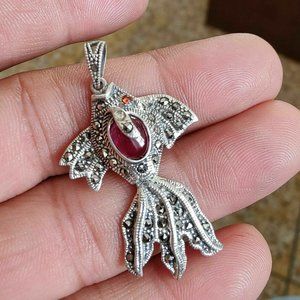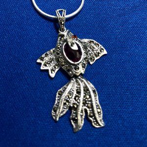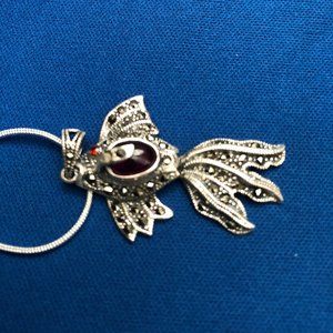 GARNET QUARTZ MARCASITE 925 STAMPED PURE STERLING SILVER THIS IS SUCH A UNIQUE FISH PENDANT, SIZE IS 5.5 GM 1.75''