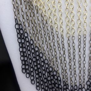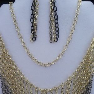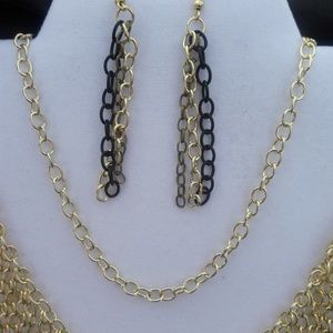 One piece necklace that looks like two! Gold, antique gold and black cable chain necklace drapes beautifully. Hook closure with gold cone accents for a more dramatic rear view. Drop earrings highlight the three chains. Fish hook.