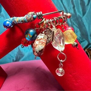 Handmade item, many from used jewelry parts, fabric, stones, beads, glass, acrylic, cording and metal.
