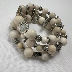 Handmade coil Beaded bracelet Chalky White Silver Tone Leaf End Caps