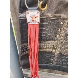 Handmade cow lover boho Leather Fringe Western bag charm, Long fringe keychain