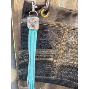 Handmade cow lover boho Leather Fringe Western bag charm, Long fringe keychain