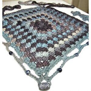 Crafted with beautiful yarn in the colors blue, teal, and gray tones. Features a striking diamond granny stitch pattern and is finished with a beautiful stone accent and beading for that extra flair. The top is lined with a stretchy, breathable, and comfortable polyester lining for extra coverage.