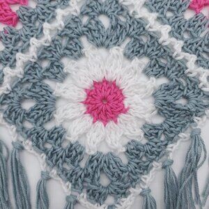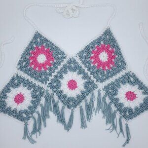 This cute top is made with a lightweight cotton blend yarn in the colors white, pink, and gray green. It is super lightweight and airy with open stitch work and fringe. It would make a perfect bathing suit cover, or wear it over a sports bra or bralette.