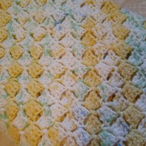 Handmade crochet throw or baby coverlet, approx 36x40 in. Multi-colored (yellow, green, blue and white). Cold water wash, gentle cycle, line dry. GUC. ..