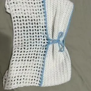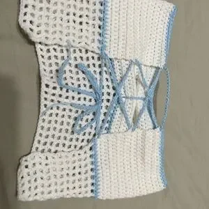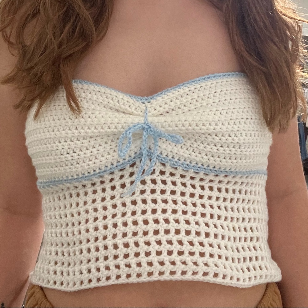 White and blue adjustable crochet top. Handmade to fit sizes xs/sm