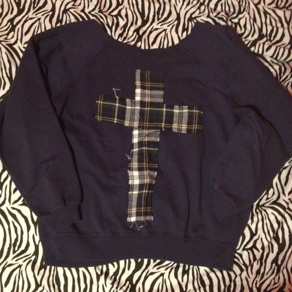 Navy blue cross sweater. Can be worn off the shoulder or regular. Fits great. Bought at a boutique