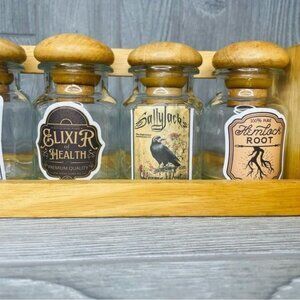 Handmade diy potion spice rack and spice bottles Halloween kitchen decoration . Bottles may need new rings around the lids if you want to use for spices as shown